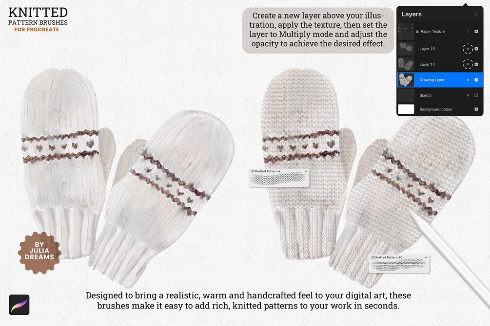Introducing my Knitted Pattern Brushes for Procreate - a collection designed to add cozy, realistic knit textures to your digital illustrations in seconds. Perfect for adding warmth and detail to your artwork, these brushes mimic the intricate patterns of various knitting styles, from simple stockinette to complex cable knits. Whether you're illustrating clothing, blankets, or holiday themed designs, these brushes will help you achieve a handcrafted, tactile feel with ease.