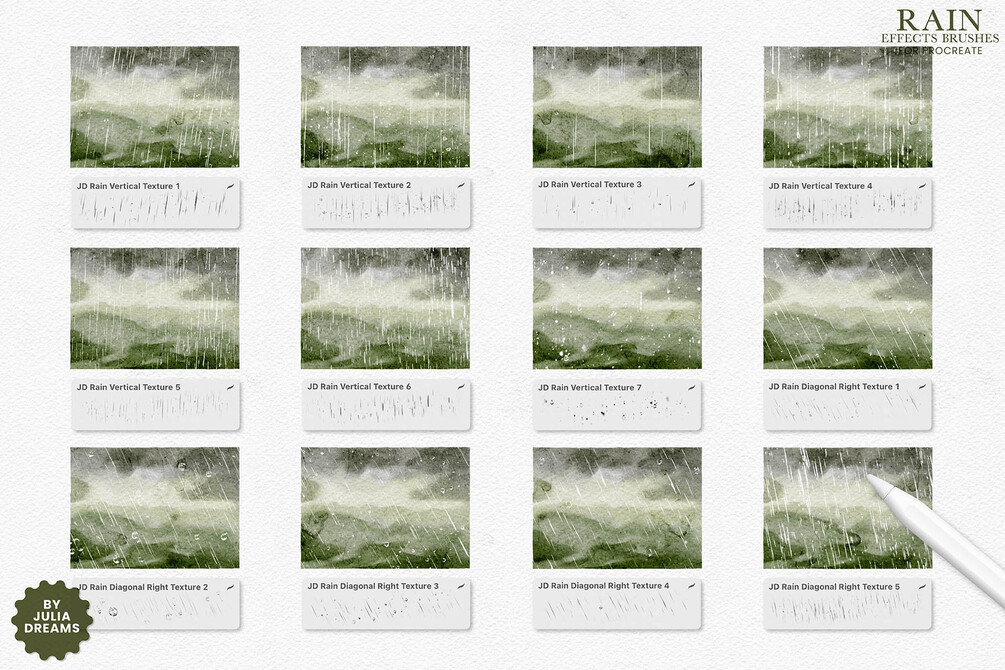- A versatile collection of vertical rain, diagonal rain (left & right), raindrops on glass, and ripple stamp brushes