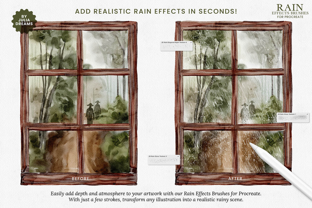 Carefully crafted to pair beautifully with watercolor textures, these brushes allow you to build dynamic compositions—ideal for cozy indoor scenes, moody landscapes, or cinematic storytelling. From soft misty showers to striking diagonal rain and rippling puddles, every brush is thoughtfully designed to enhance realism and artistic expression.