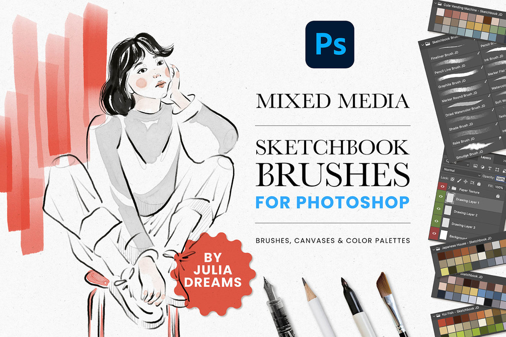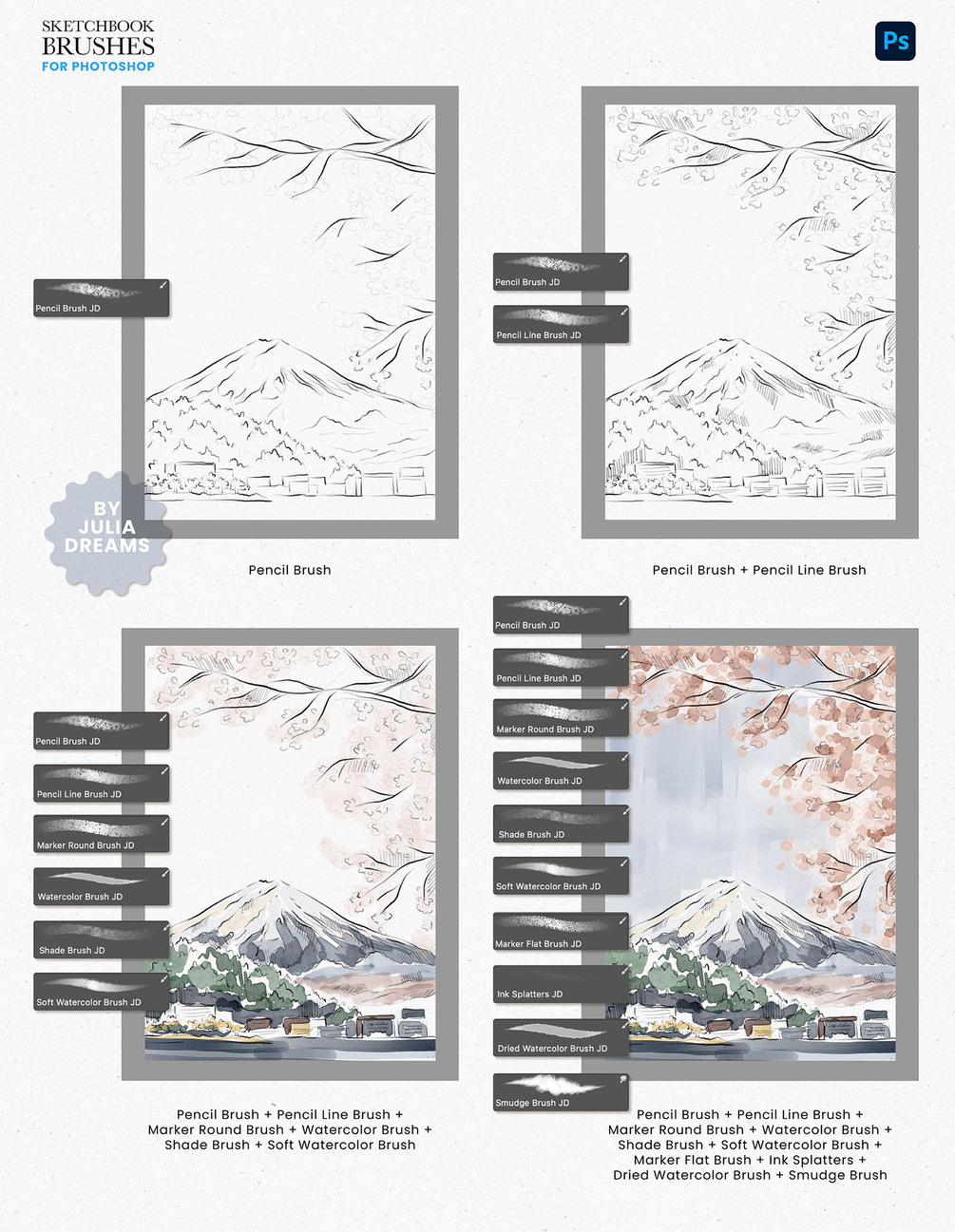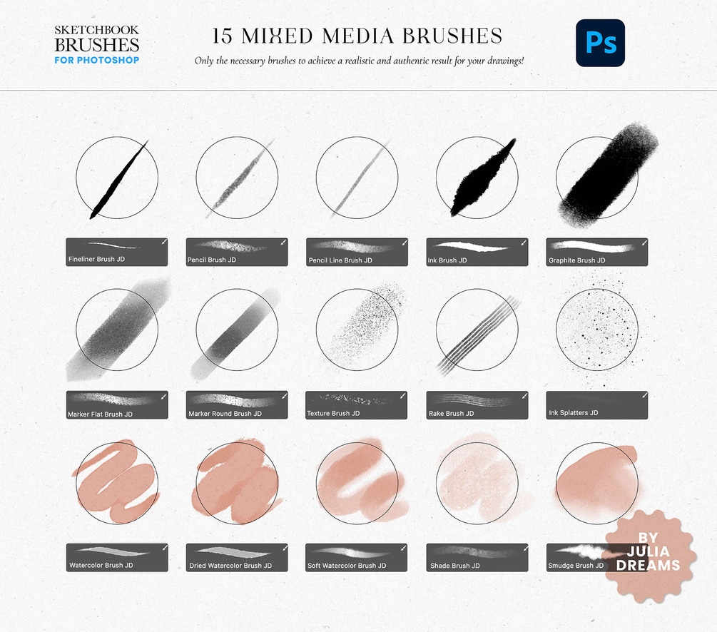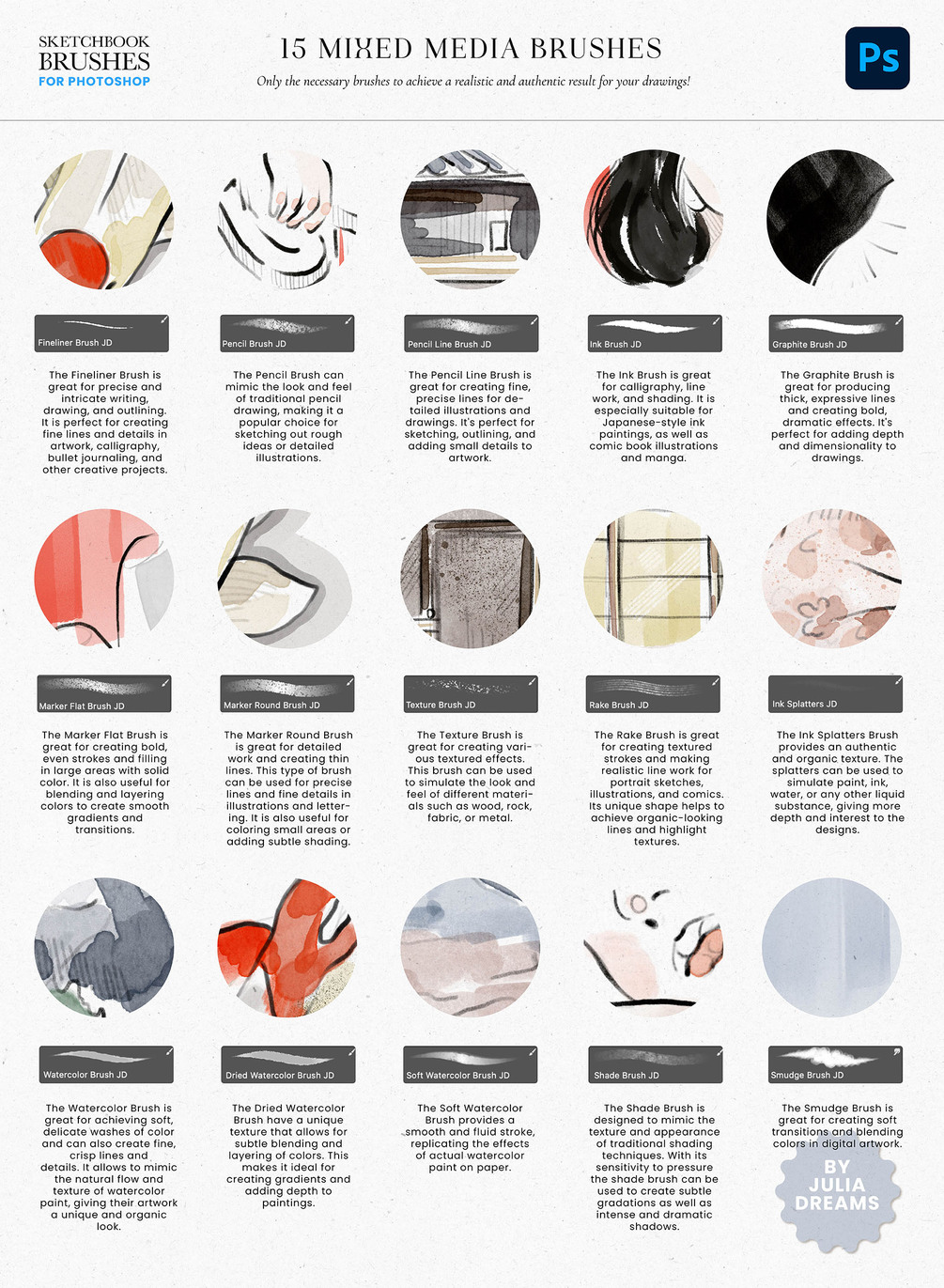 Sketchbook Brushes for Photoshop / Mixed Media includes: