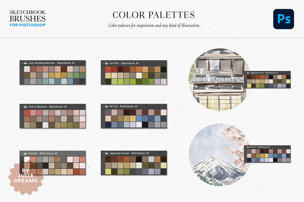This collection has been carefully designed with attention to detail. Magic canvases and only the essential brushes included to achieve real results, color palettes and sketches for a quick start.