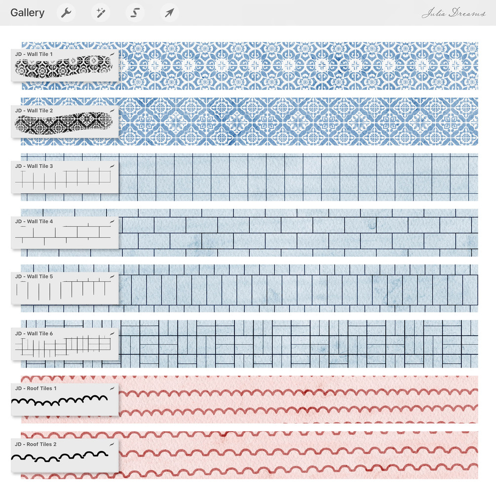 I'm excited to introduce my new set of wall and roof tile brushes, perfect for creating detailed architectural drawings and building illustrations. These brushes are seamless patterns that help you quickly apply a pattern to any area.