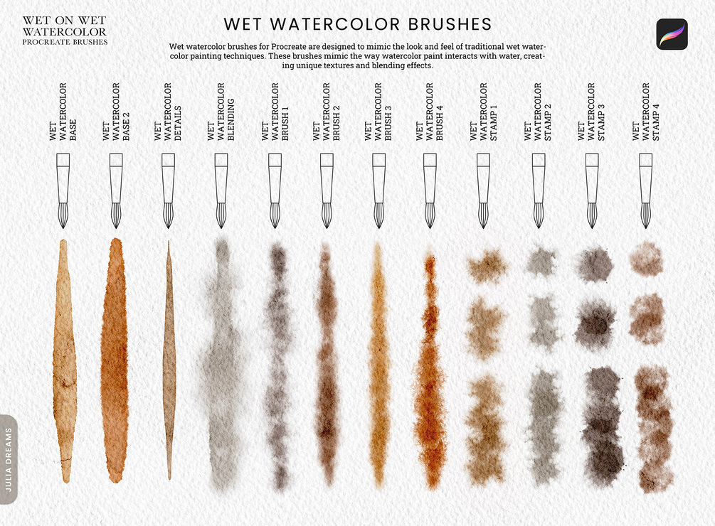Wet Watercolor Brushes for Procreate are digital tools designed to mimic the look and feel of wet watercolor painting on paper. This collection has been carefully designed with attention to detail. Magic canvases and only the essential brushes included to achieve real results.